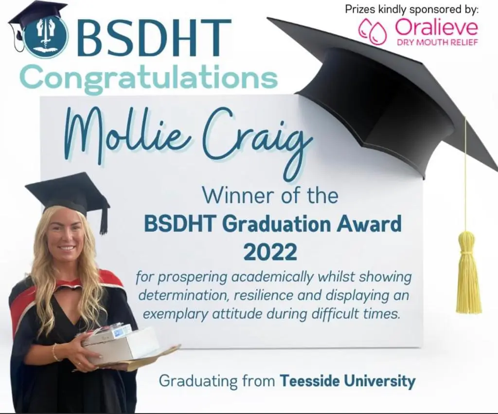 During my studies the Grange welcomed me back to complete 1:1 training with their Therapist Charlotte for 1 day a week. From this I grew in confidence when treating patients and went on to achieve a first class honours in my degree. I was delighted to hear that I also won the BSDHT graduation award for Teesside University
